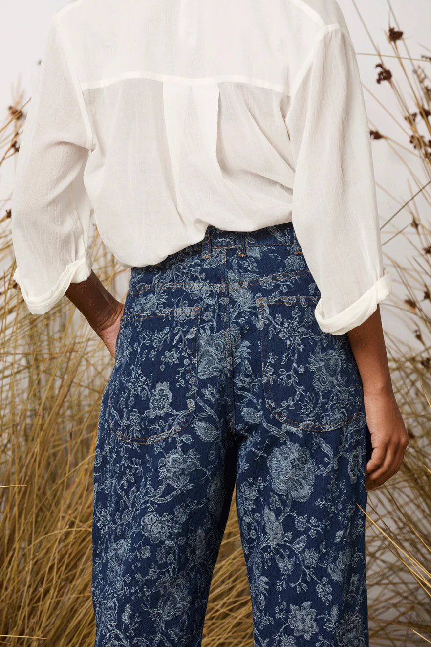 Elevate your style with the M.A.Dainty Disconnected Jean, featuring a high-waisted, wide-leg cut in dark wash cotton denim. The white floral embroidery and gold button accents add a refined touch, while the ankle-length design and discreet inseam pockets combine fashion with function. Perfect for dressing up or down, these jeans create a flattering silhouette that pairs effortlessly with blazers or cozy knits for any occasion. Experience comfort and sophistication in one versatile piece.